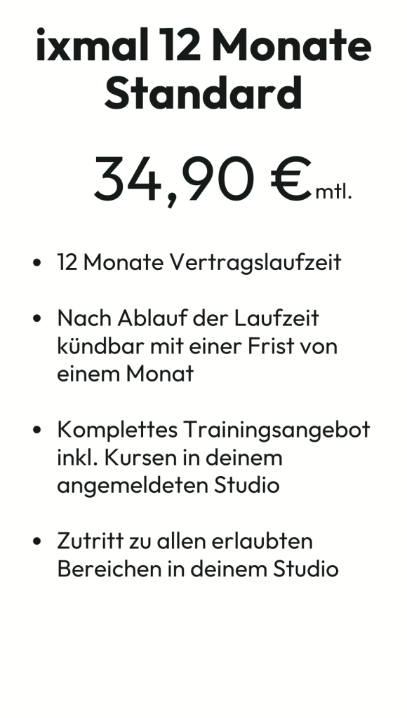 *Sichere dir innerhalb des Aktionszeitraumes vom 01.04.2026 bis zum 30.04.2026 den Aktionstarif Frühlingskracher und trainiere bei Abschluss einer 12-Monatsmitgliedschaft in den ersten 3 Monaten für nur 9,99 EUR anstatt 34,90 EUR inkl. der Getränkeflatrate (0,00 EUR anstatt 5,00 EUR mtl.), dem Kaffee-Abo (0,00 EUR anstatt 5,00 EUR mtl.) und dem BODYSHAKE-Abo (0,00 EUR anstatt 5,00 EUR mtl.) innerhalb der Mindestvertragslaufzeit. Die Aktion gilt in allen teilnehmenden ixmal SPORT FITNESS HEALTH Studios. Nach Ablauf der 3 Monate erhöht sich der monatliche Beitrag auf 24,90 EUR statt 34,90 EUR. Bei Abschluss des Aktionstarifes fallen zusätzlich eine einmalige Aktivierungsgebühr in Höhe von 29,90 EUR sowie eine halbjährliche Servicepauschale in Höhe von 29,90 EUR an. Die Aktivierungsgebühr sowie die Servicepauschale werden unmittelbar nach Vertragsabschluss fällig. Der Gesamtpreis beträgt 343,77 EUR statt 688,50 EUR, damit hast Du eine Ersparnis von 344,73 EUR. Alle Tarife können online oder in deinem Studio vor Ort abgeschlossen werden. Die Aktion ist nicht mit anderen Aktionen kombinierbar. **keine Sauna in Aschaffenburg